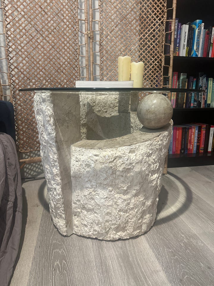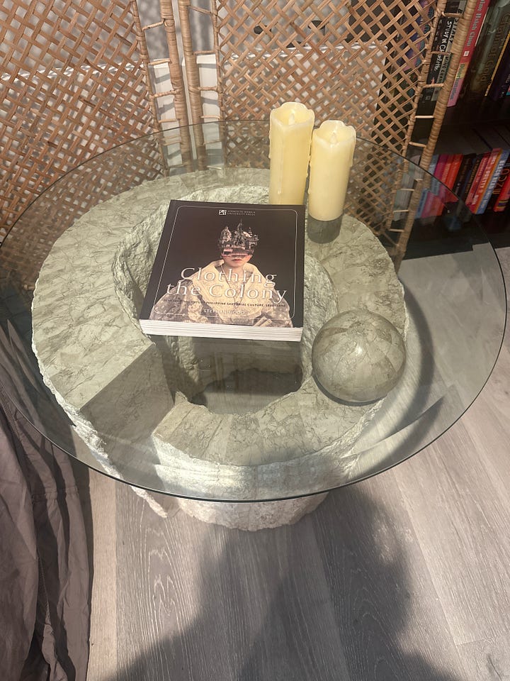 (a stone + glass coffee two-piece coffee table from FB marketplace that was an absolute steal, and I’m in love with it. it also happens to be made in the Philippines. fun fact: we picked up the Clothing the Colony book at UP in the Philippines in their used book store. s/o ateneo de manila university press.)