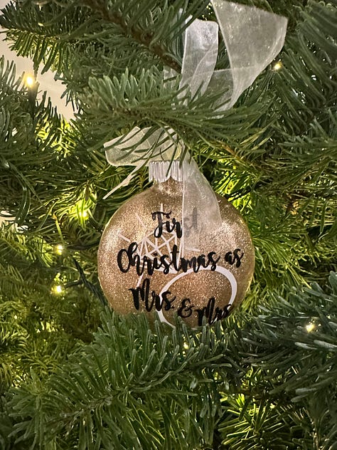 (doormat from lavender, new silver lamp and 1 of 3 (!) leather chairs (not pictured here) from FB marketplace, two angles of our library, our first ornament on my first real tree)